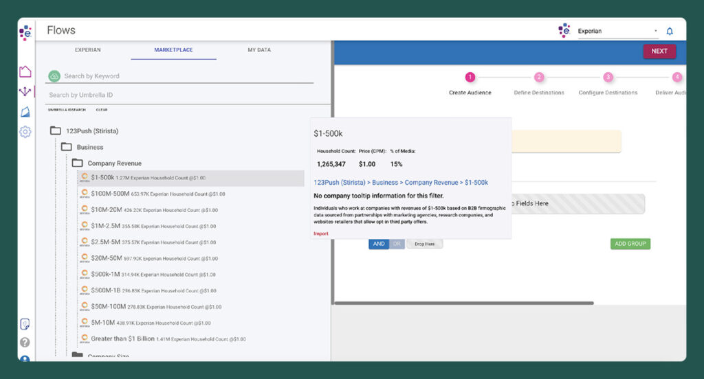 Experian’s Data Marketplace is a licensed product. A pre-existing relationship and access to Experian’s Audience Engine Marketplace is required to access this data. If you are unsure of your ability to access their platform or are interested in gaining access, please contact Experian, or reach out directly to Stirista so we can connect you with an Experian resource.